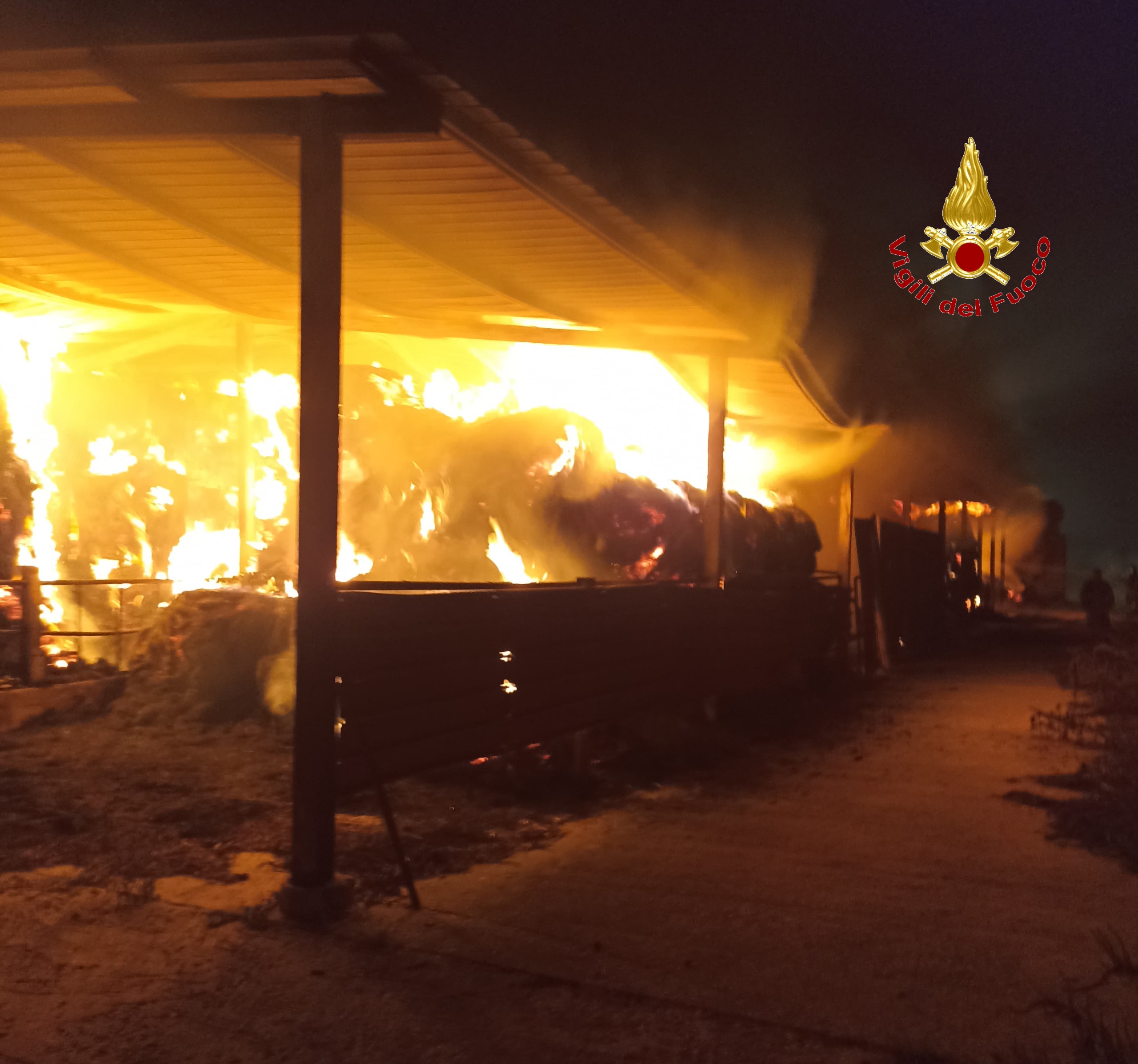 All’arrivo delle prime squadre, la scena che si è presentata era drammatica: un imponente capannone di circa 600 metri quadrati era già parzialmente avvolto da un rogo furioso. Le fiamme, alimentate dal materiale altamente infiammabile, si levavano alte verso il cielo notturno, proiettando ombre danzanti e una densa colonna di fumo nero e acre, visibile a distanza. All’interno della struttura, il fuoco stava divorando circa quaranta rotoballe di fieno, trasformandole in gigantesche torce incandescenti e generando un calore infernale.