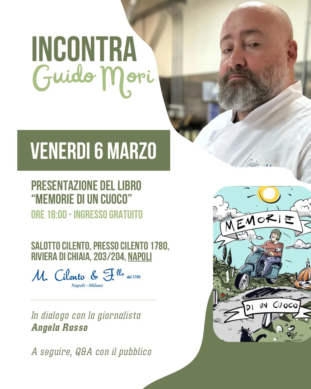 Al centro dell’incontro ci sarà il suo libro, un’opera intima e personale in cui Mori intreccia ricette e frammenti di vita: viaggi, incontri, amori e momenti che hanno segnato il suo percorso umano e professionale. Un racconto che supera la semplice dimensione gastronomica per trasformarsi in memoria, esperienza e riflessione, pubblicato dopo il precedente volume Questa è cucina.