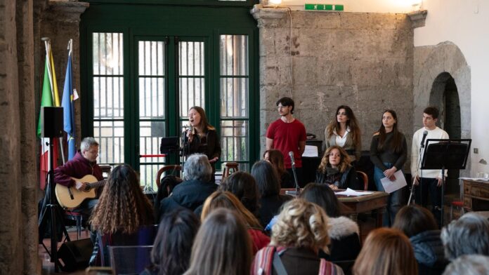 Cinque giorni dopo, il 20 marzo, il secondo colpo, in una location di tutt’altro calibro: la prestigiosa Sala della Loggia al Maschio Angioino, simbolo del potere cittadino. Il modus operandi, ormai collaudato, è stato replicato con fredda precisione. Questa volta l’arma del delitto culturale è stata “L’amore impossibile” di Chiara Tortorelli (edizioni Homo Scrivens). Il musicista Marco Gesualdi è tornato sulla scena, affiancato questa volta dalla cantante Valeria di Stefano. Ancora una volta, l’incursione teatrale è stata affidata agli attori della scuola di Roberta Inarta. L’effetto è stato identico: la platea è stata catturata, costretta a confrontarsi con la potenza di una narrazione che mescola letteratura, musica e recitazione.