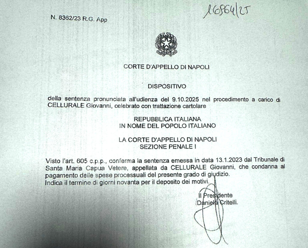 La I Sezione Penale della Corte di Appello di Napoli, presidente Daniela Critelli, ha confermato la condanna nei confronti di Giovanni Cellurale, esponente del clan dei Casalesi all’ergastolo per omicidio di camorra, per le minacce di morte rivolte alla direttrice dei quotidiani Cronache di Napoli e di Caserta e del quotidiano online cronachedi.it Maria Bertone.