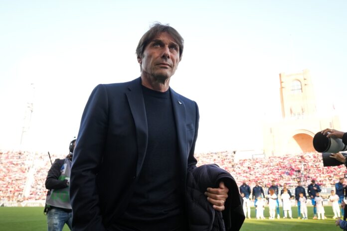 Napoli's head coach Antonio Conte looks on during the Serie A soccer match between Bologna and Napoli at the Renato DallÕAra Stadium in Bologna, north Italy - Sunday, November 9, 2025 - (Photo by Massimo Paolone/LaPresse)