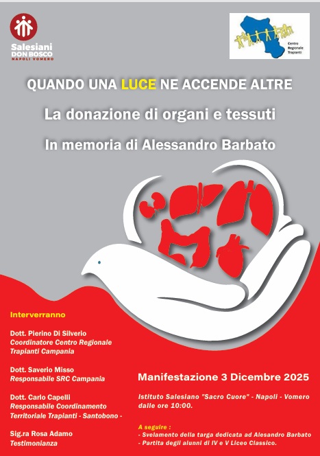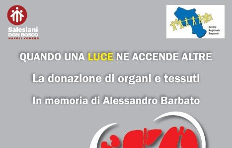 NAPOLI – Si terrà martedì 3 dicembre, a partire dalle ore 10, nell’auditorium “Salvo D’Acquisto” dell’Istituto Salesiano “Sacro Cuore” di Napoli-Vomero, l’evento “Quando una luce ne accende altre: la donazione di organi e tessuti in memoria di Alessandro Barbato”. L’iniziativa è dedicata al giovane studente del liceo classico del plesso di via Scarlatti, prematuramente scomparso la scorsa estate, proprio alla vigilia del suo ultimo anno di scuola (il quinto), quello che lo avrebbe accompagnato all’esame di maturità, ed i cui organi la famiglia ha scelto di donare.