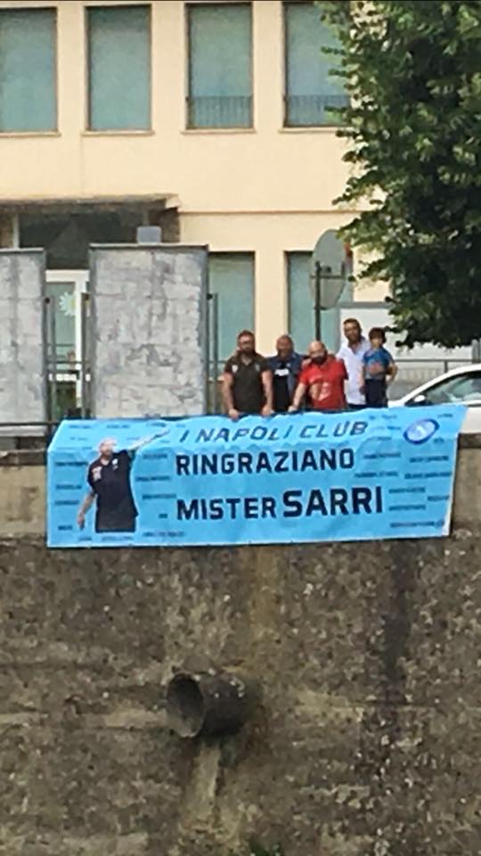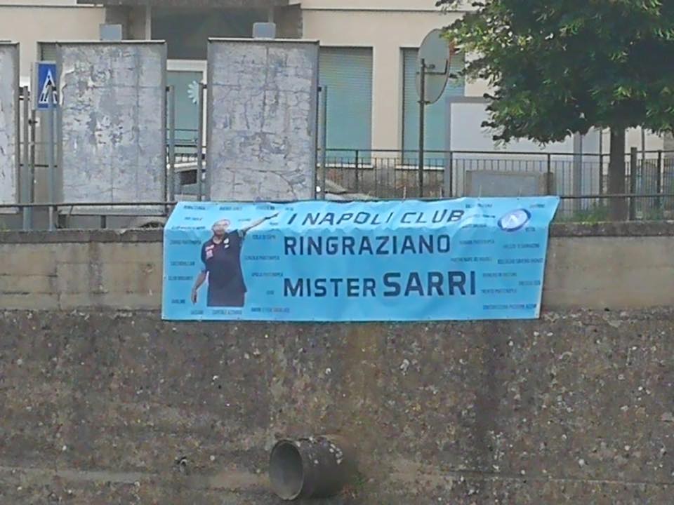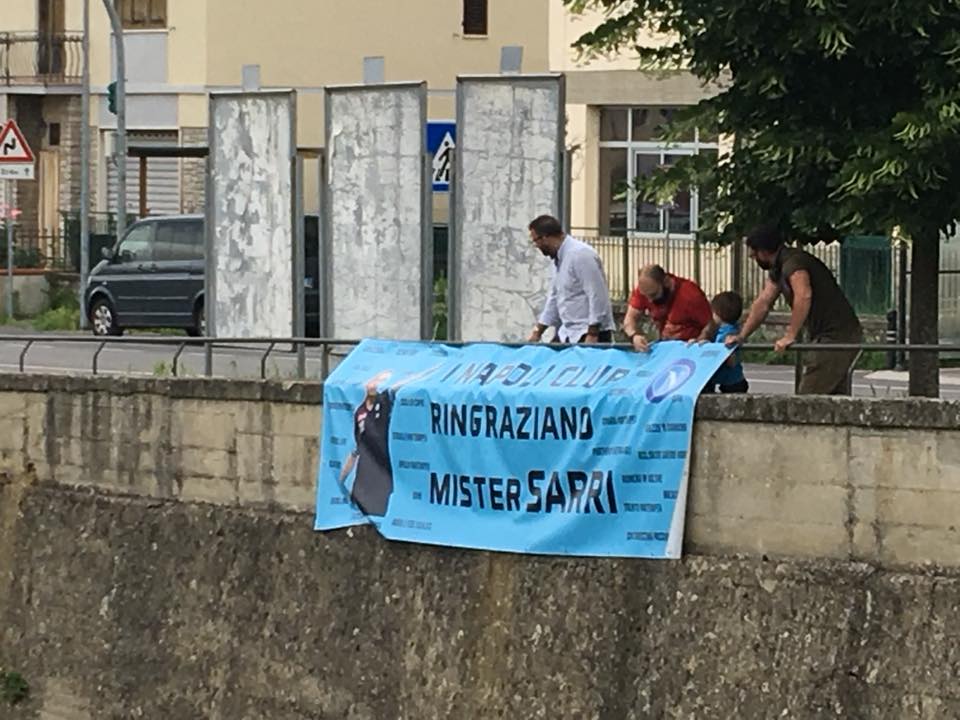 Oggi pomeriggio i supporter del Club Napoli Maurizio Sarri di Figline Valdarno, fondato dai fratelli Carmine e Agostino Iaiunese – originari di Casal di Principe – hanno esposto uno striscione all’esterno dell’abitazione dell’ormai ex tecnico azzurro in Toscana.